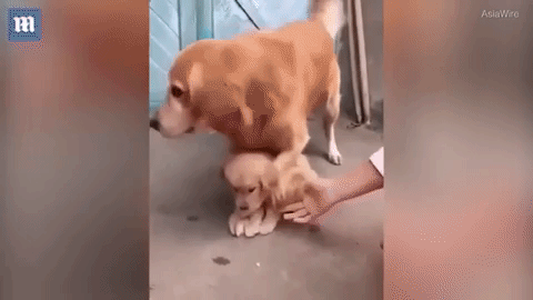 Хозяин говорит: «Давай пожмём руки», но умный пёс даёт свою лапу, лишь бы никто не трогал его щеночка. Хозяин остаётся недовольным:
