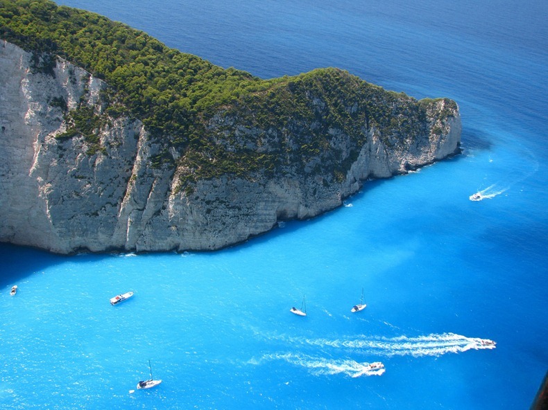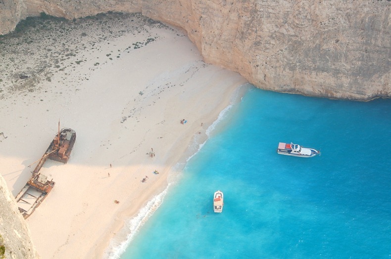 Остров Закинф, особенно бухта Навайо это любимое место туристов, живописные скалы, чистая голубая минерализованная целебная вода и белоснежный песок, а также разбитый пиратский катер ни одного человека не оставят без хороших впечатлений после посещения этих мест.