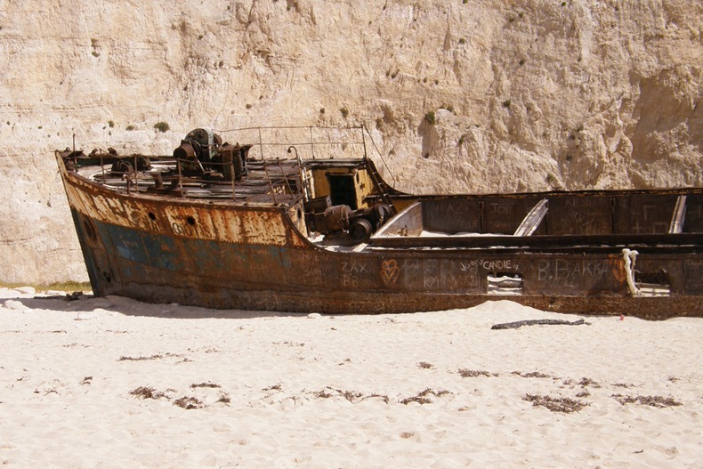 Я там дважды была ( сверху и на лодке). Пляж такой интересный - мелкие светлые камушки, а в самом корабле много русских отметилось (например, большими буквами Зенит было написано). Люблю Закинф, надеюсь ещё много раз там буду.